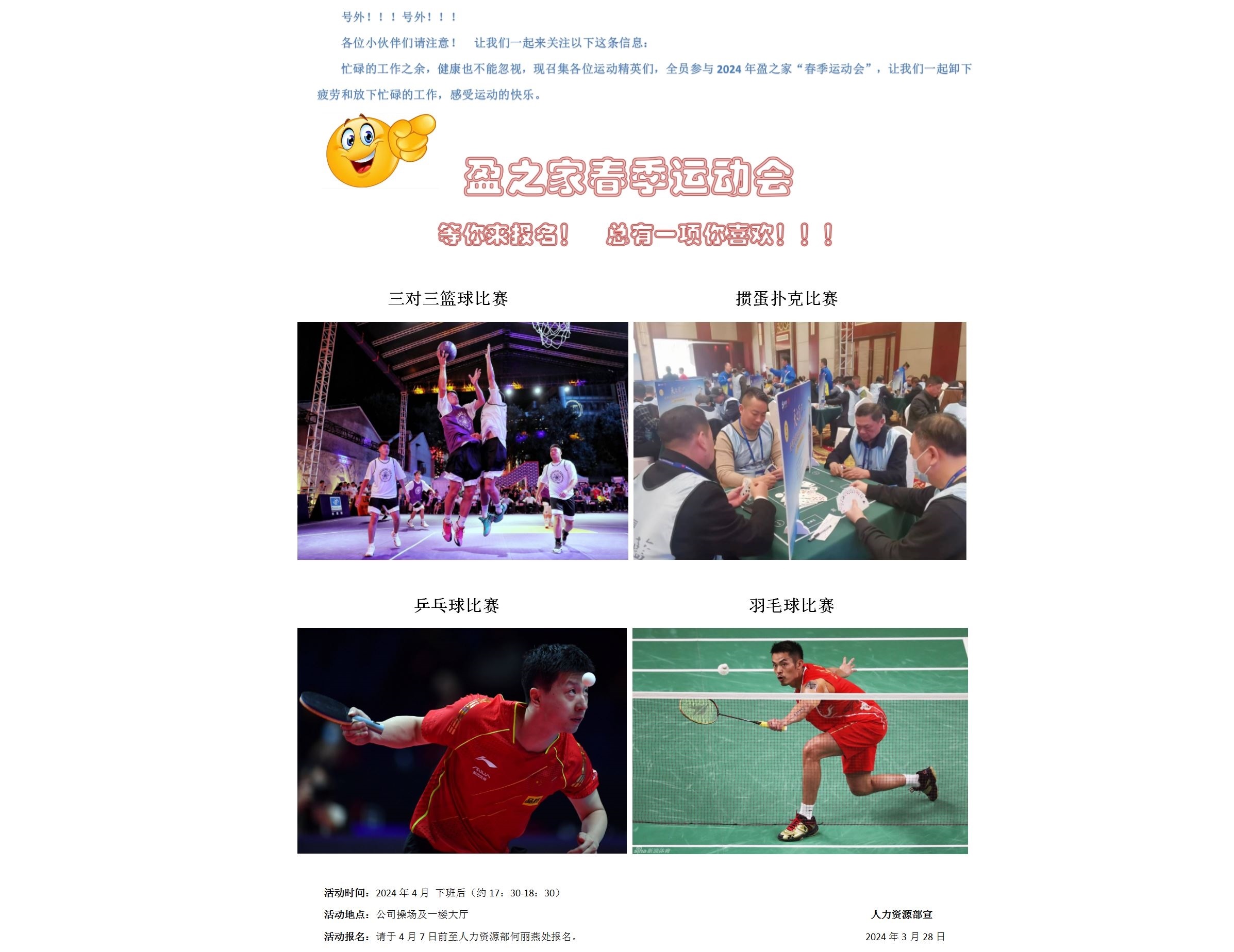 忙碌的工作之余,健康也不能忽視,現(xiàn)召集各位運(yùn)動(dòng)精英們,全員參與 2024 年盈之家“春季運(yùn)動(dòng)會(huì)”,讓我們一起卸下疲勞和放下忙碌的工作,感受運(yùn)動(dòng)的快樂。